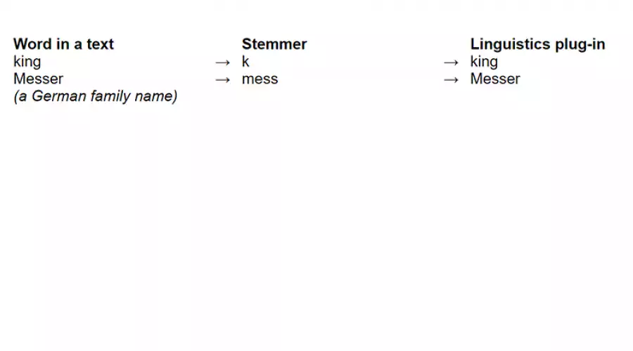 The following technologies are integrated in this solution: starting from a professional identification of language and word boundaries – also of complex terms – a very precise morphological base form normalization process measurably improves search quality. Thereby the search for "author" also delivers hits with the word "children's book author". A search for "book" will also provide hits for declined forms such as "books".