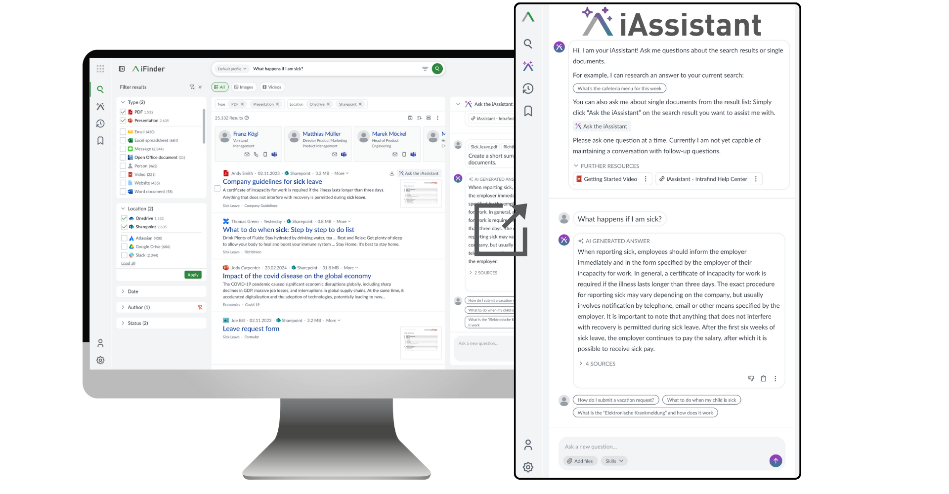 The iAssistant integrates seamlessly into iFinder search results, delivering answers based on your organization's data – either as a standalone app or through API integration into your environment.